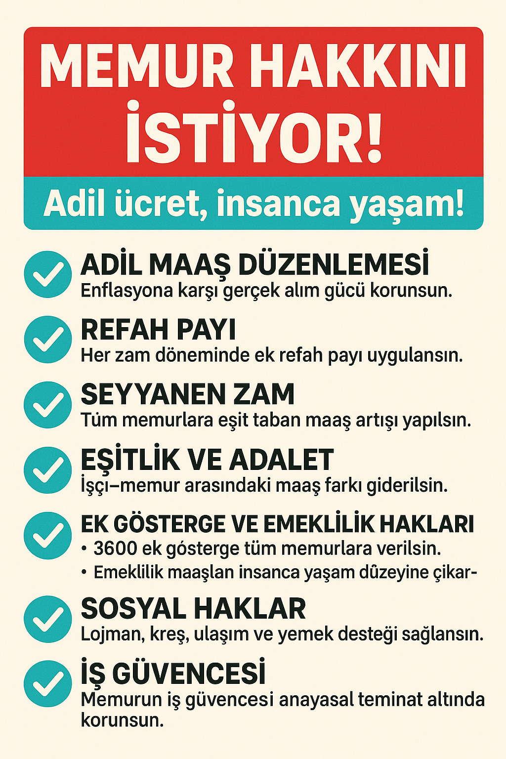 Toplu Sözleşme Görüşmelerinde Adaletli olunmalı ve Memurun ve emeklisinin hakları tam ve eksiksiz verilmelidir.